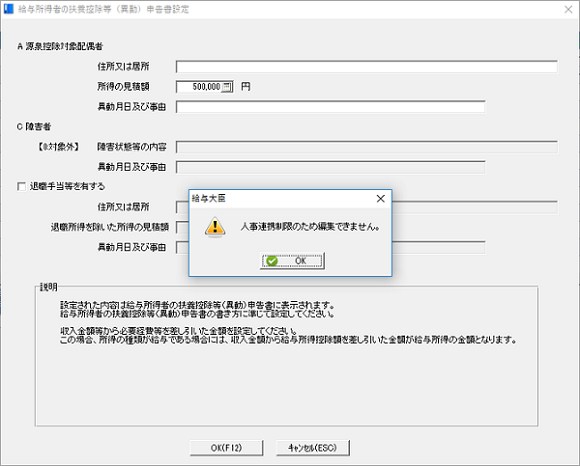 人事大臣の家族情報と連携している場合は、以下のメッセージが出て、給与大臣側で家族登録の所得の見積額が入力できない場合があります。