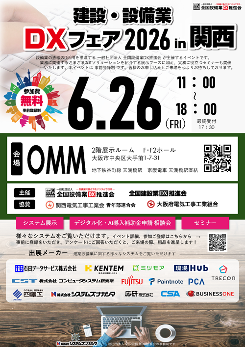 | 主 催 | 一般社団法人全国設備業DX推進会/全国建設業DX推進会 共催:関西電気工事工業会 青年部連合会/大阪府電気工事工業組合 |