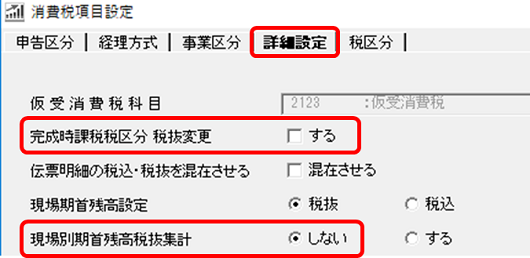 [試算表]の「完成時課税区分 税抜変更」の設定は、[初期設定]-[消費税項目設定]で確認してください。「詳細設定」をクリックし「完成時課税区分の税抜変更をする」のチェックを外してください。