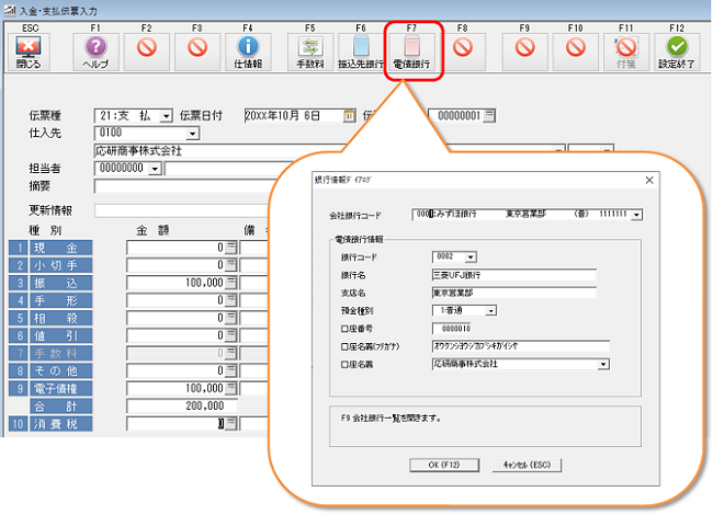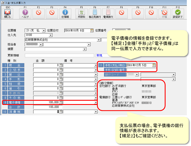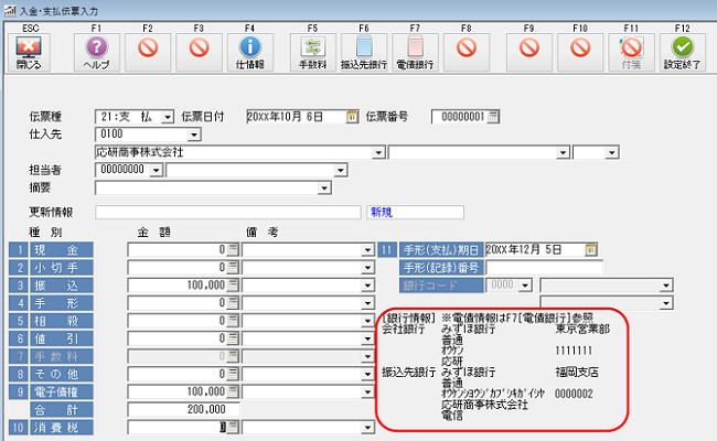 支払伝票にて、「振込」と「電子債権」を同一伝票で入力する場合、伝票入力画面上の銀行情報は「振込先銀行情報」が表示されます。