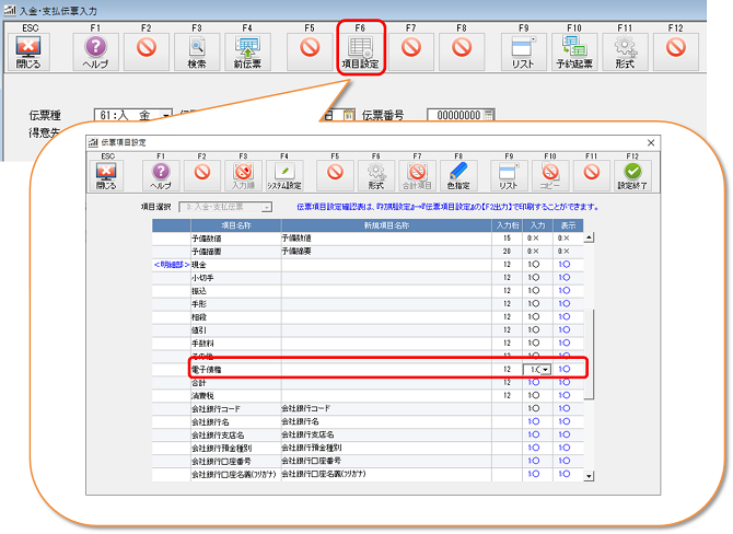 [伝票入力・発行]-[伝票入力[入金・支払]]を開き、F6[項目設定]をクリックしてください。
