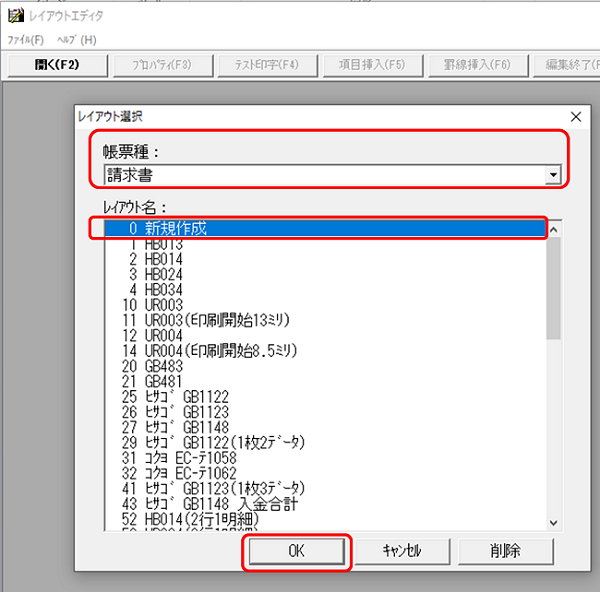 レイアウト選択が起動します。罫線を配置したいレイアウト[1001:HB014(自社用社印付)]を選択して[OK]をクリックしてください。