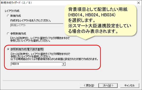 「参照新規作成(電子請求用)」を選択し、背景項目として配置したい用紙HB014を選択して[次へ]をクリックしてください。