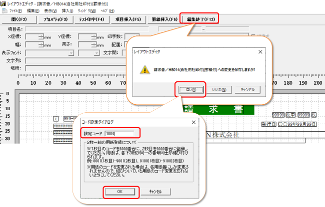 [編集終了]をクリックし、保存メッセージを[はい]で進み、レイアウトの設定コードを確認し[OK]をクリックしてください。(設定コードは自動的に登録済みの最大番号+1が表示されます。)
