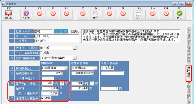 [社員登録]で該当社員を呼び出し、「保険情報」タブをクリックしてください。