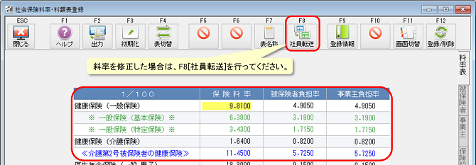 料率を修正した場合は、F8[社員転送]を行ってください。