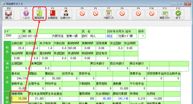 「健康保険」にカーソルをあわせて、F2[固定設定]をクリックしてください。健康保険が再計算されます。