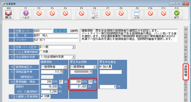 [社員登録]で該当社員を呼び出し、「保険情報」タブをクリックしてください。