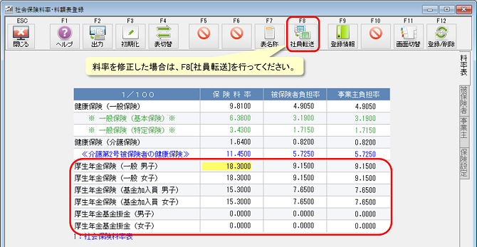 料率を修正した場合は、F8[社員転送]を行ってください。
