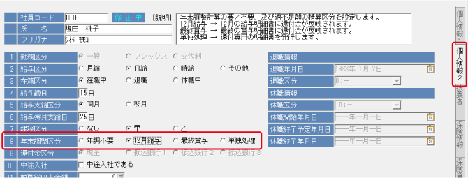 [社員登録]を開き、「個人情報2」タブの「年末調整区分」を確認してください。