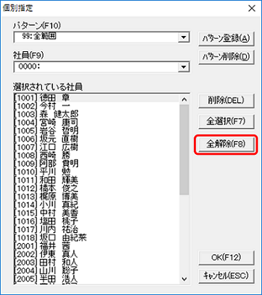F8[全解除]をクリックすると「選択されている社員」欄が空欄になります。