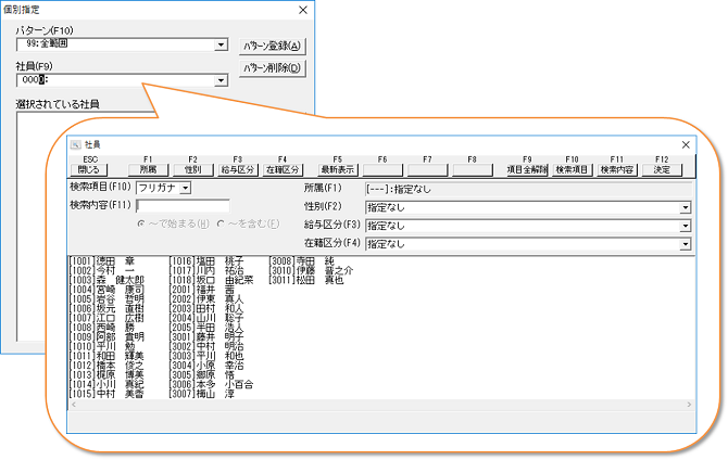 社員選択欄でF9[一覧]をクリックすると、社員個別指定画面が表示されます。