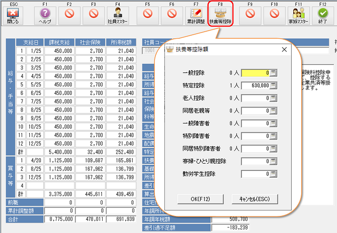 F8[扶養等控除]より控除額を入力することもできますが、源泉徴収票の扶養者数等に反映されません。
