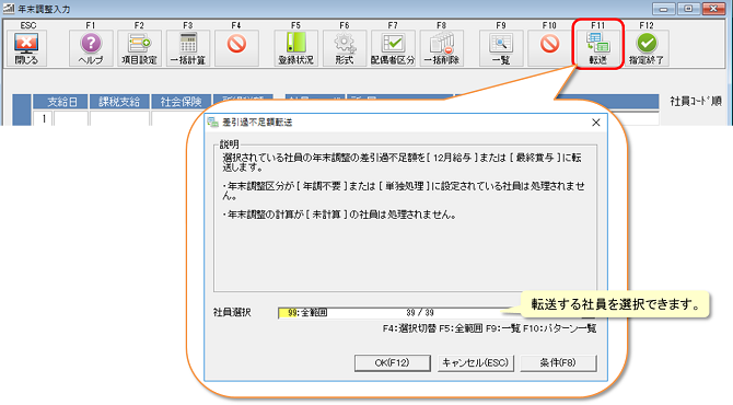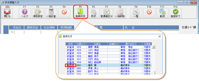 [社員登録]-「個人情報2]タブの年末調整区分が「12月給与」または「最終賞与」で、 既にF11[転送]まで