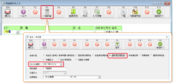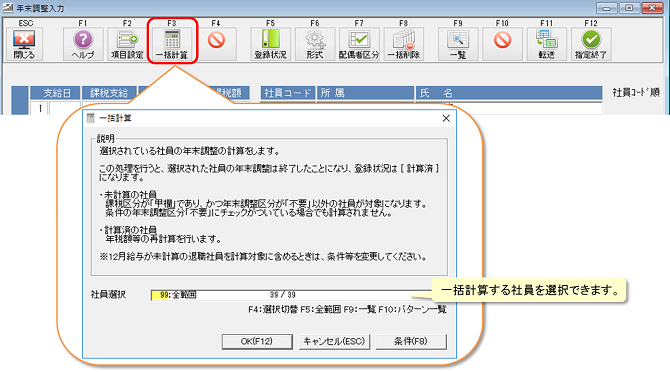 ※社員を選択していないときにF3[一括計算]が表示されます。