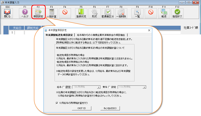 ※社員を選択していないときにF2[項目設定]が表示されます。