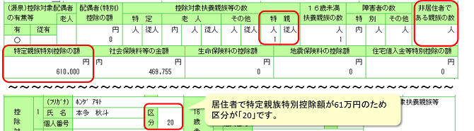 特定親族特別控除の適用を受けた場合は、 特定親族の所得・居住・非居住等に応じて以下の数値が入ります。