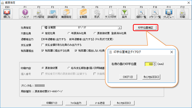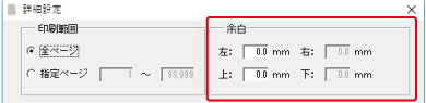 F2[出力]-F3[詳細設定]で、余白の調整を行ってください。 上下または左右にずらしたい量(ミリ数)を、現在の余白の値に加減します。 マイナスの値も入力できます。