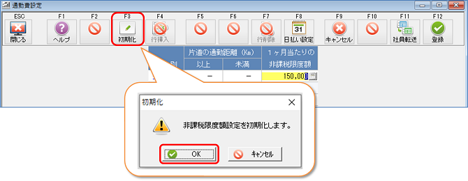 @[初期設定]-[通勤費設定]を開いてF3[初期化]をクリックし、次のメッセージで[OK]をクリックしてください。