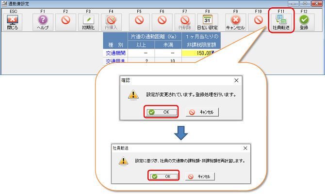 BF11[社員転送]をクリックし、次のメッセージで[OK]をクリックしてください。