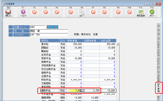 「1:固定」の場合・・・[社員登録]の「給与単価」タブで通勤手当の「課税単価」と「非課税単価」を修正してください。