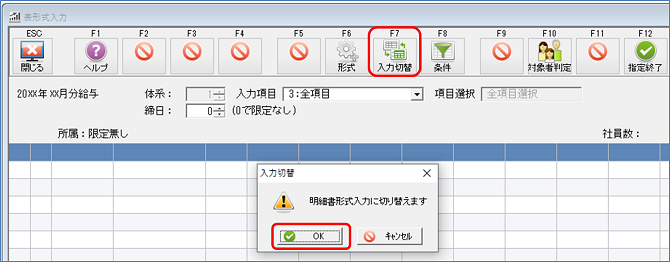 F7[入力切替]をクリックすると次のメッセージが表示されますので、[OK]をクリックしてください。