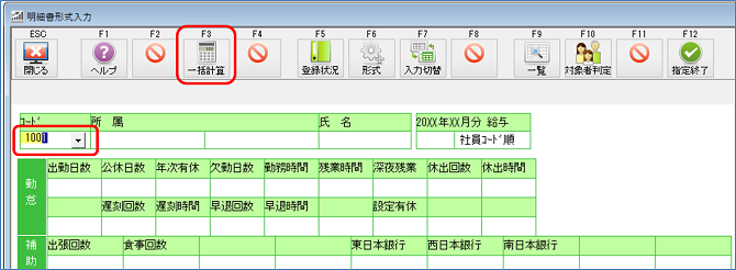 2.社員コード欄にカーソルがある状態で、F3[一括計算]をクリックしてください。