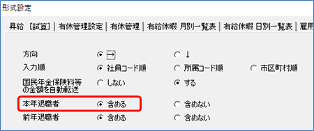退職者が表示されない場合は、F6[形式]をクリックして、「退職者」(Super/ERPの場合は「本年退職者」)を「含める」に設定してください。