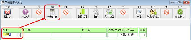 @[データ入力]から再計算を行う給与月を開き、社員コードにカーソルがある状態でF3[一括計算]をクリックし