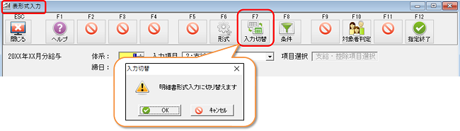 [データ入力]を開いた際に「表形式入力」となっている場合は、F7[入力切替]をクリックし、入力切替メッセージを[OK]で進んで「明細書形式」に切り替えてください。