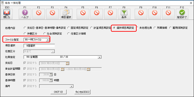 A「給与一括処理」の画面が表示されます。処理内容は「選択項目再設定」、ファイル指定は「99:一時ファイル」を選択し、キーボードの[Enter]キーを押してください。