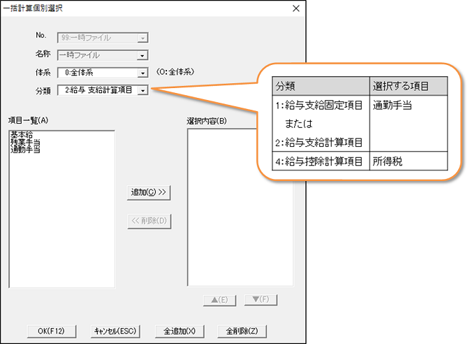 B「一括計算個別選択」の画面が表示されます。分類を下記のように切り替えて「通勤手当」と「所得税」を項目一覧から選択し、[追加]をクリックします。
