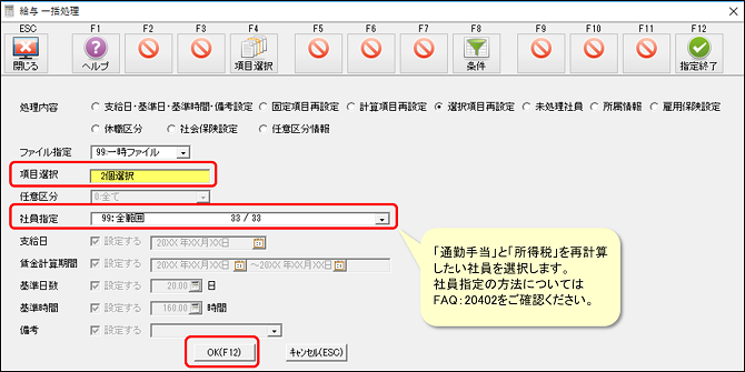 また、「社員指定」で「通勤手当」と「所得税」を再計算したい社員を選択してください。