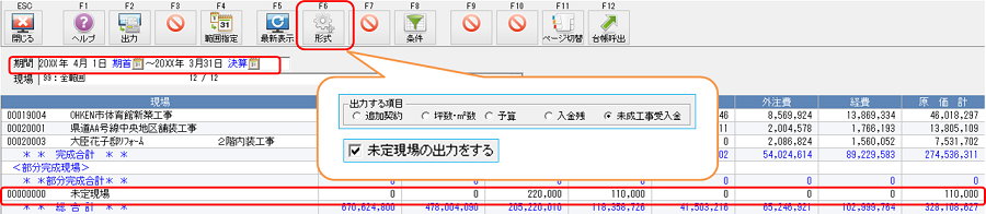 期間はF4[期首]〜F5[決算]を指定しF12[指定終了]で集計すると、未定現場(プロジェクト)が表示されます。