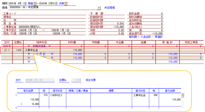 現場(プロジェクト)が指定されていない未成工事支出金(仕掛品)の仕訳の一覧が表示されますので、該当の伝票をダブルクリックし、現場(プロジェクト) を指定してください。