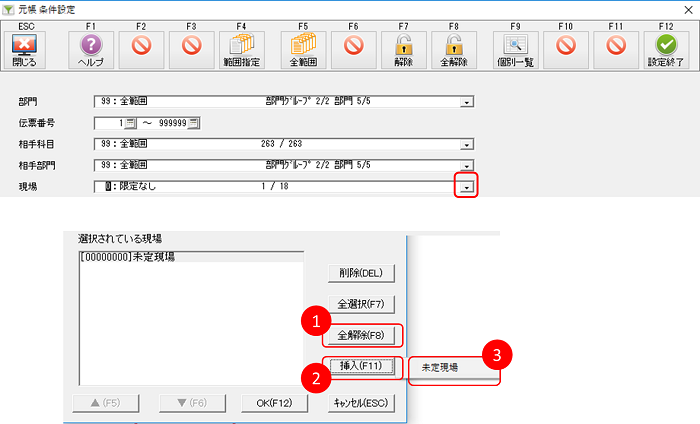 [元帳]でF8[条件]をクリックし、現場(プロジェクト)で未定現場(プロジェクト)を選択します。