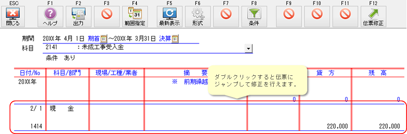 期間はF4[期首]〜F5[決算]を指定し、科目は未成工事受入金(前受金)を選択して集計してください。
