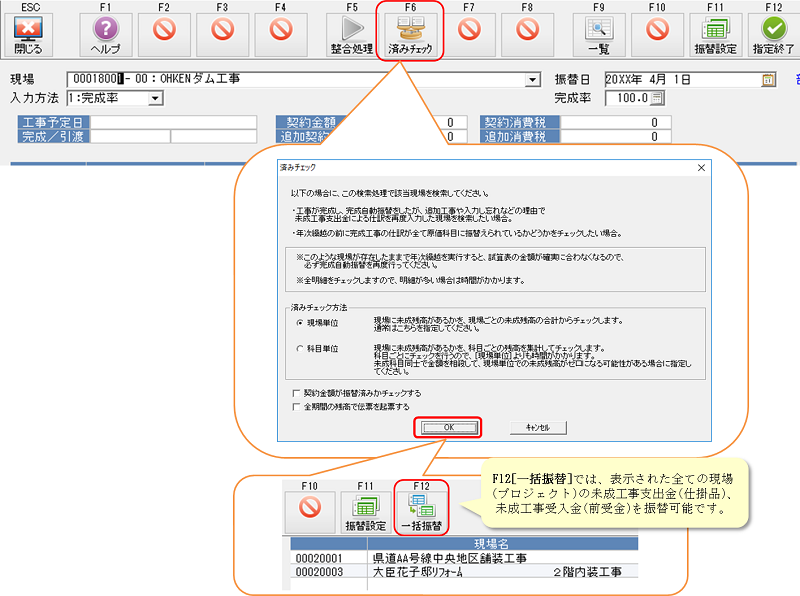 F6[済みチェック]を実行すると、未成工事支出金(仕掛品)、未成工事受入金(前受金)の残高がある完成現場(プロジェクト)が表示されます。