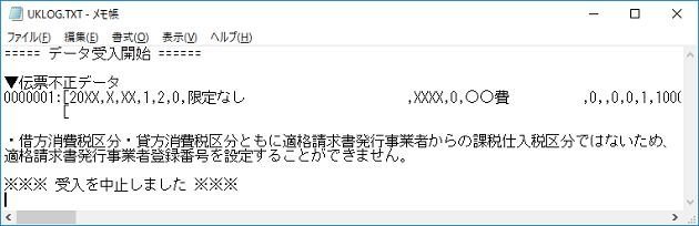 上記のメッセージは、課税仕入税区分以外の税区分を設定している明細に、適格事業者番号があるファイルを受入した場合に出ます。
