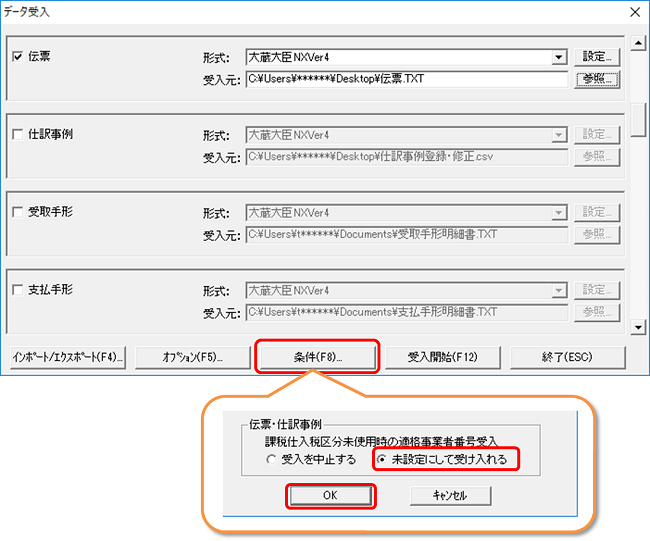 [特殊処理]-[データ受入]の[条件]をクリックして、「伝票・伺い書(福祉大臣/公益大臣の場合のみ)・仕訳事例」の設定を、「未設定にして受け入れる」にチェックを付けて[受入開始]を行ってください。