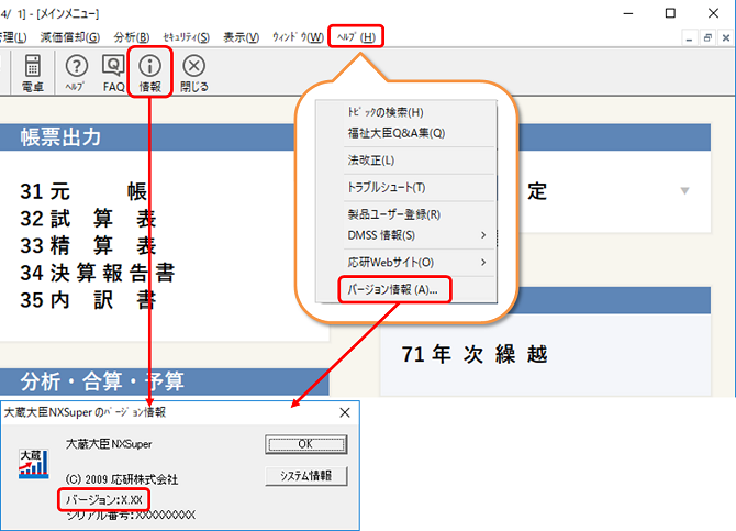 バージョンは、メインメニューの上部[情報]又は[ヘルプ]-[バージョン情報]から確認することができます。