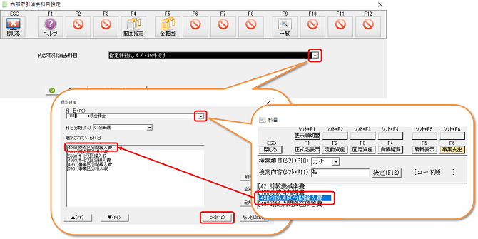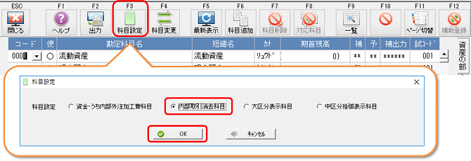 [初期設定]-[勘定科目登録]で、F3[科目設定]をクリックします。「内部取引消去科目」を選択して、[OK]をクリックしてください。