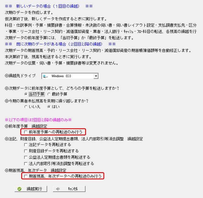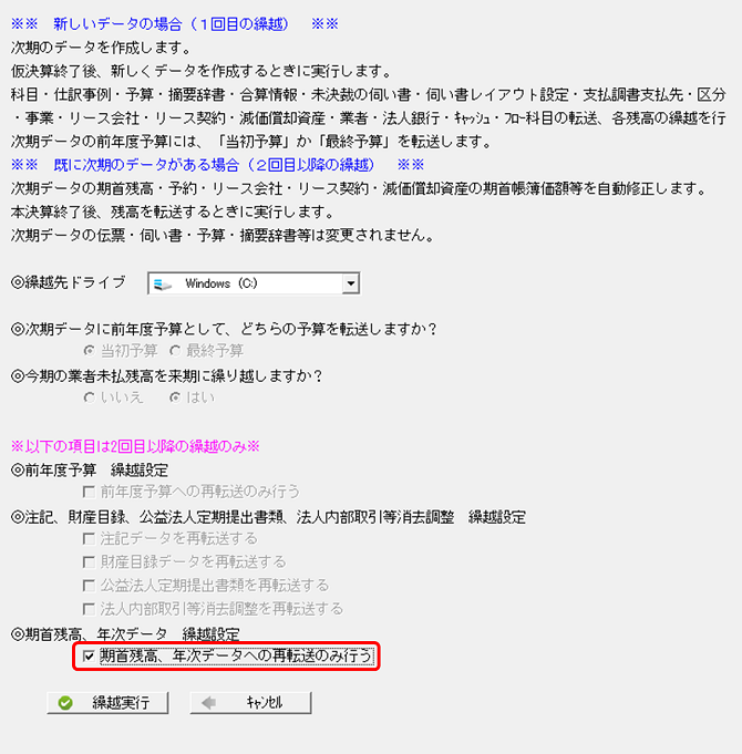「期首残高・年次データへの再転送のみ行う」にチェックを付け、繰越を行います。