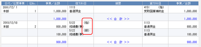 [基本データ設定]の「財源区分対象科目」に設定済みの科目の元帳の場合、金額欄の左端に財源区分として「(般)」「(指)」のいずれかを出力します。