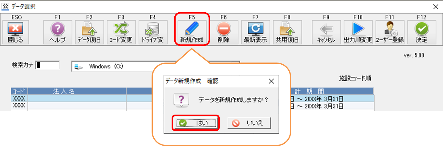 @『公益大臣』を起動し、データ選択画面でF5[新規作成]をクリックしてください。