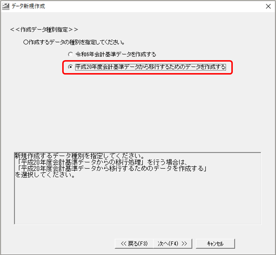 C「平成20年度 会計基準データから移行するためのデータを作成する」を選択し[次へ]をクリックしてください。