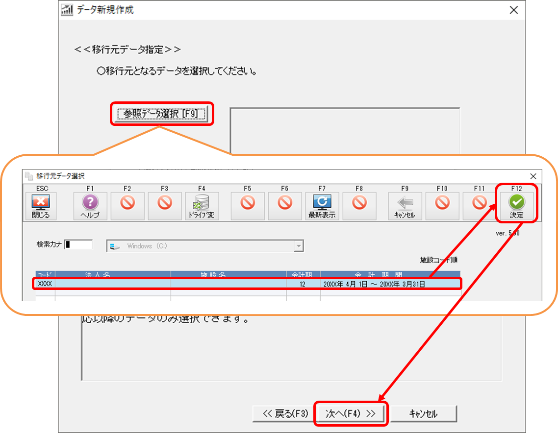 移行元データを選択してF12[決定]→[次へ]をクリックしてください。