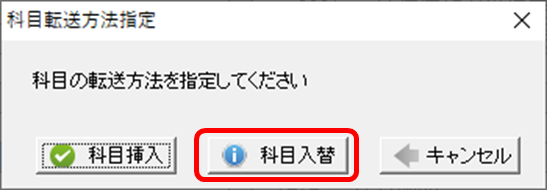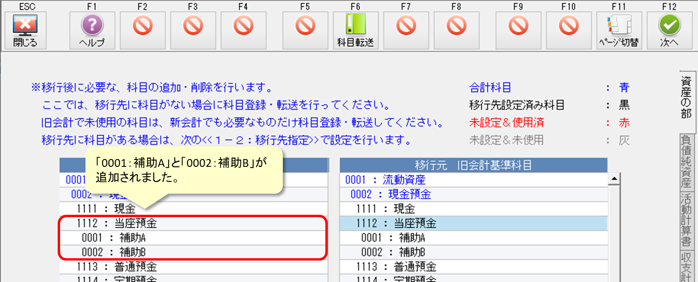 「移行元 旧会計基準科目」にある補助科目を「移行先 新会計基準科目」に追加したい場合は[科目入替]を使用してください。