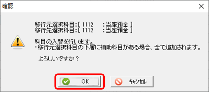 「移行先 新会計基準科目」の「1112:当座預金」をクリックして、ダブルクリック、またはF12[決定]をクリックしてください。