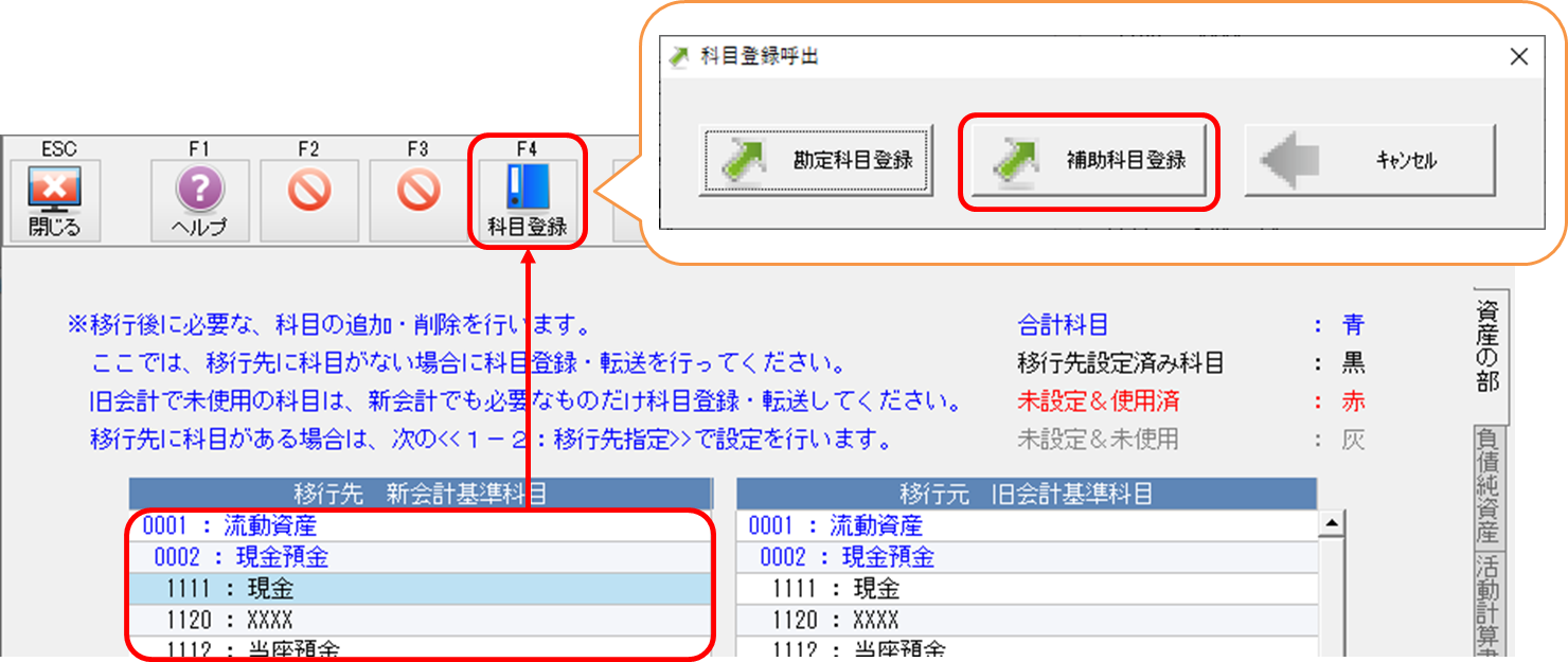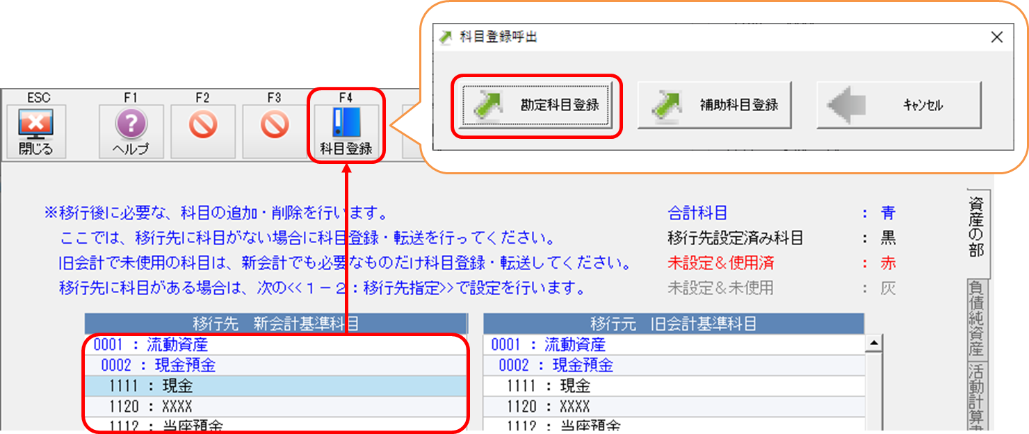 「移行先 新会計基準科目」の科目をクリックしている状態で、F4[科目追加]をクリックし「勘定科目登録」を選択すると[勘定科目登録]の画面に移ります。